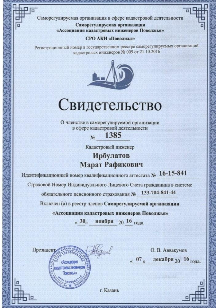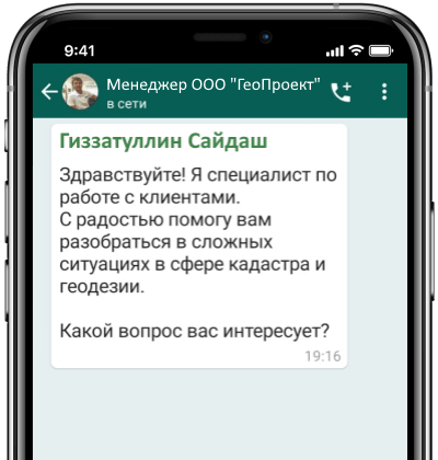 • Кадастровый инженер приехал, отстрелял все точки участка, так же на месте решили вопрос по увеличению участка. Марат все грамотно разъяснил, подсказал как лучше это сделать, за что ему огромное спасибо. В середине мая заказал схему расположения участка для перераспределения. Работать с данной организацией мне очень понравилось, соблюдают сроки, приемлемые цены и всегда можно получить информацию по работе в ватсап.