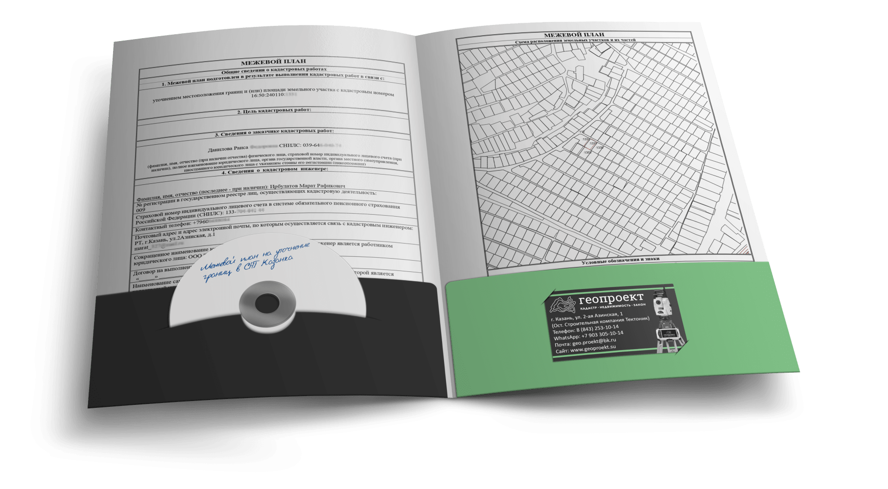 После выполнения геодезических и землеустроительных работ вы получаете межевой план участка на CD диске, подписанный кадастровым инженером